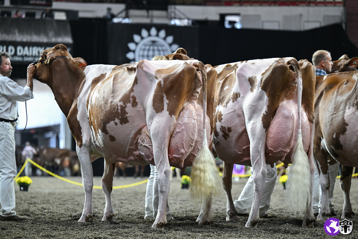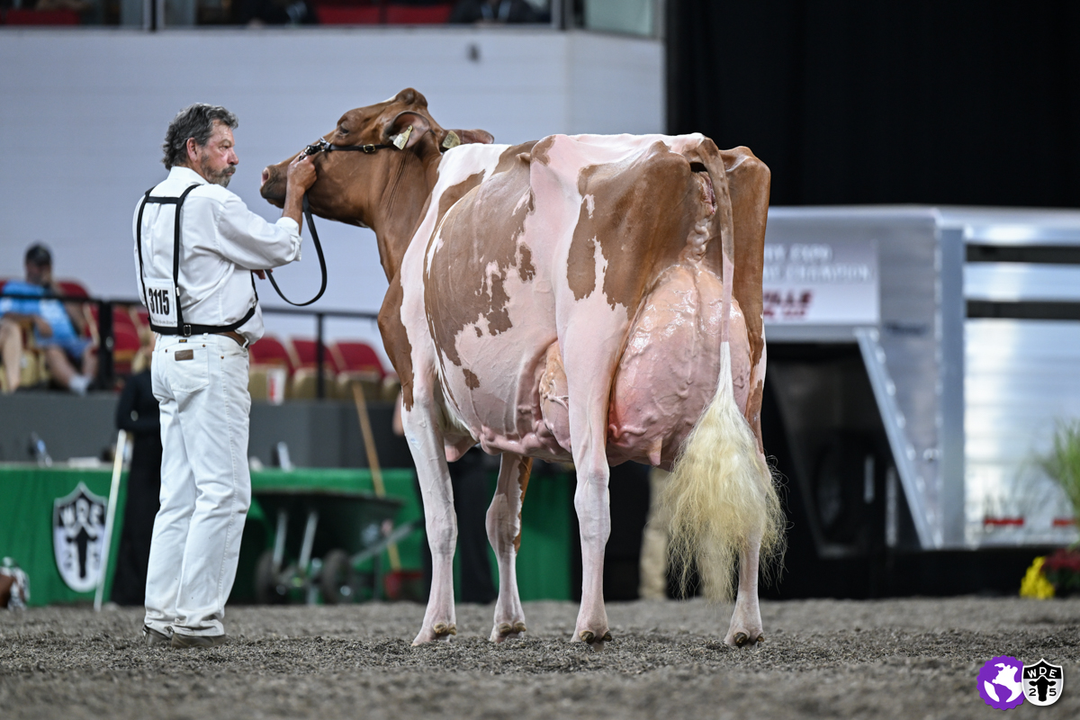 It was almost Premium Apple Crisp Lilly-Red who took home the Grand Champion title for the third time in a row at the International Red & White Show, last weekend in Madison! The Apple Crisp daughter of Butlerview Farm won the Grand Champion title at the World Dairy Expo in 2024 & 2023! This year she won her class with Aged Cows, 6 Years old & Older, the R&W Reserve Senior Champion title and the Reserve Grand Champion title. It was Golden-Oaks Temptres-Red EX-94-USA that was named as Grand Champion of the International Red&White Show by judge Adam Hodgins and associate Joel Phoenix! Temptres-Red is an Unstopabull-Red daughter, owned by Milk Source, Fischer, Steincrest & Crescentmead, Kaukauna, Wisconsin and is straight out of Miss Pottsdale DFI Tang-Red EX-94-USA. She is the Defiant *RC daughter who was Honorable Mention Senior Champion Midwest Spring National R&W Show 2019 and more!