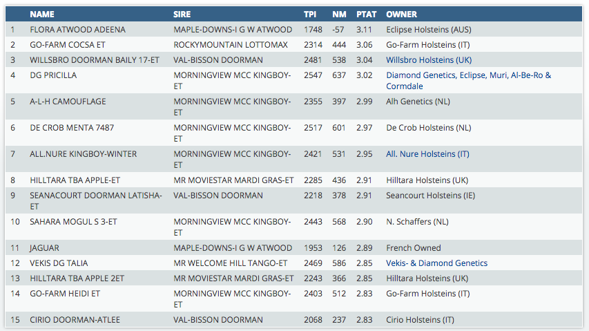 The American intermediate run of May 2015 took place yesterday, the #1 and #2 heifer in the European run are the full sisters All.Nure Supershot Papsy 1505 and Papsy 1499, both out of a Numero Uno daughter of the former #1 GTPI cow Muri Planet Popsy VG-87-IT 2yr. They are testing GTPI +2712 and GTPI +2705! The highest PTAT animal this run was Flora Atwood Adeena VG-87-ES 2yr., the full sister of Eclipse Atwood Archrival, the #1 PTAT bull in the breed and out of the great MS Kingstead Chief Adeen cow family! Click further for the topranking GTPI and PTAT lists of the May run.
