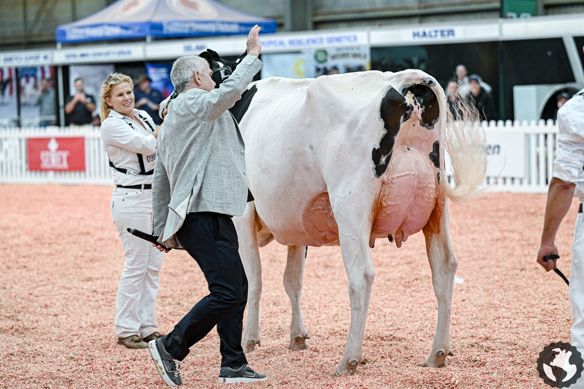 Australia’s National Holstein Show 2026 has ended with Windy Vale ATW Frosty 2 (s. Alltheway) named as Grand Champion! Judging this year’s show was Mark Nutsford of Cheshire, England. He tapped out Melaleuca Arrow Lautella as Intermediate Champion after, she won her class with Senior 3yr. old cows. She is sired by King Doc son NH DG Arrow. Arrow is bred by Diamond Genetics & Nosbisch Holsteins and sold to AI-Total. The King Doc son out Al-Lew Monterey Ashley EX-95-USA has already a lot of beautiful daughters worldwide! With 3770 daughters in his US-index at 1151 herds, he shows us +2720 GTPI with +2.19 PTAT and +1.54 UDC! Furthermore he has +0.02% Fat and +0.03% Protein in his index with +2.04 Stature, +1.41 Strength, Sloped and Wide Rumps and +2.20 Fore Udder Attachment, +1.89 Rear Udder Height and +1.70 Rear Udder Width!