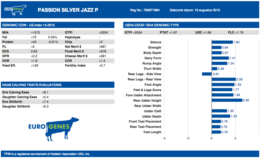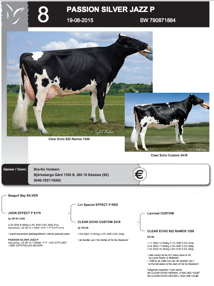 Bra-Ko Holsteins from Sweden sells one of the highest GTPI Polled heifers in Europe without Powerball as a sire in the Tulip Sale on Friday, December the 11th. Lot 8 in the sale is Passion Silver Jazz P with GTPI +2504 with a nice balanced index and very attractive pedigree as a POLLED Silver daughter from an Effect, from a Custom followed by Clear Echo 822 Ramo 1200 EX-94-USA, her full sister is the dam to Bookem! For more info, pictures and index sheet, click further!