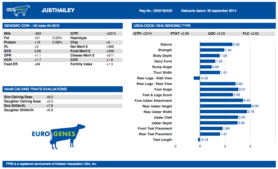 Genomic Sheet of Justhailey (Lot 5 in the Eurogenetique Sale '15)