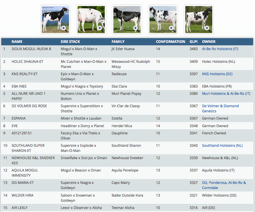 Sioux Mogul Nueva 8 is the new official #1 GLPI heifer in Europe with GLPI +3483. She is a Mogul dtr from the JK Eder Nueva-family which sold through the Eurogenes Summer Sale to Al-Be-Ro Holsteins from Italy, Al-Be-Ro has 3 more dtrs in this Top 25 with 2 dtrs of the famous Muri Planet Popsy and the new name in the list, DG Maria. This Supersire from the Caps Mairy family sells in the Vente Drakkar 2013 (www.drakkarholsteins.com), as well as the #16 in the list Evelina from the UFM-Dubs Eroy cow family. Click further to see the complete list.