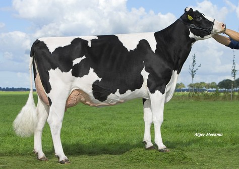 Molenkamp Shelby 1, owned by Molenkamp Holsteins recently scored Excellent, with that she is the very first daughter by Delta Emerald which is now Excellent! She goes back through her Baxter mother x Lucky Mike x Jesther on the Dutch Midwolder Susan cow family. Shelby 1 is projected in her 2nd lactation for over 14.000kg Milk in 305 days.