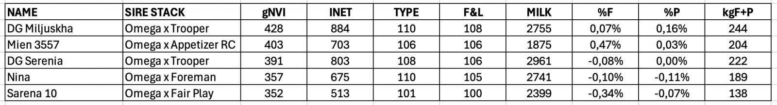 DG Omega is the complete and topranking Monteverdi son in the Netherlands at +311 gNVI, bred by Diamond Genetics. He guarantees +1970kgM with +0.06%F and +0.00%P, +577 INET, solide health traits and a balanced type. His first testing progeny came back with indexes, from which his highest daughter, DG Miljuskha came in as the Nr. 11 B&W gNVI heifer at +428 gNVI and is the Nr. 1 INET heifer at +884 INET. Markable is the Nr. 2 INET heifer in this ranking at +803 INET, she is also sired by Omega and is full sister to the Nr. 1! Dam to these heifers is Trooper daughter DG Serina, she is sold during Eurogenes After Summer Sale 2025 and goes back Gen-I-Beq Goldwyn Secret *RC VG-87-CAN 2jr. 6*.