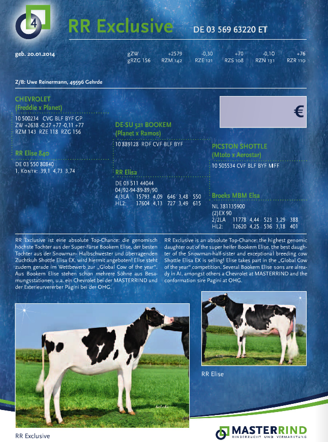 Rinderzucht Reinermann from Germany offerings a fantastic consignment from the World famous Elsa cow family at the Masterrind Opportunity Sale. RR Exclusive will sell; she is a +156 RZG Chevrolet daughter! Her 2 full brothers are already in AI at OHG and Masterrind. Dam is RR Elise, one of the very best Bookem dtrs in Europe, which scored VG-87-DE after just 5 weeks fresh. She is also dam of the Germanys #1 proven type bull Pagini. Grand dam is the World famous brood cow, Broeks MBM Elsa. She is the Mondial cow of the Year 2011, dam to Snowman and grand dam to Omanoman and Elburn!