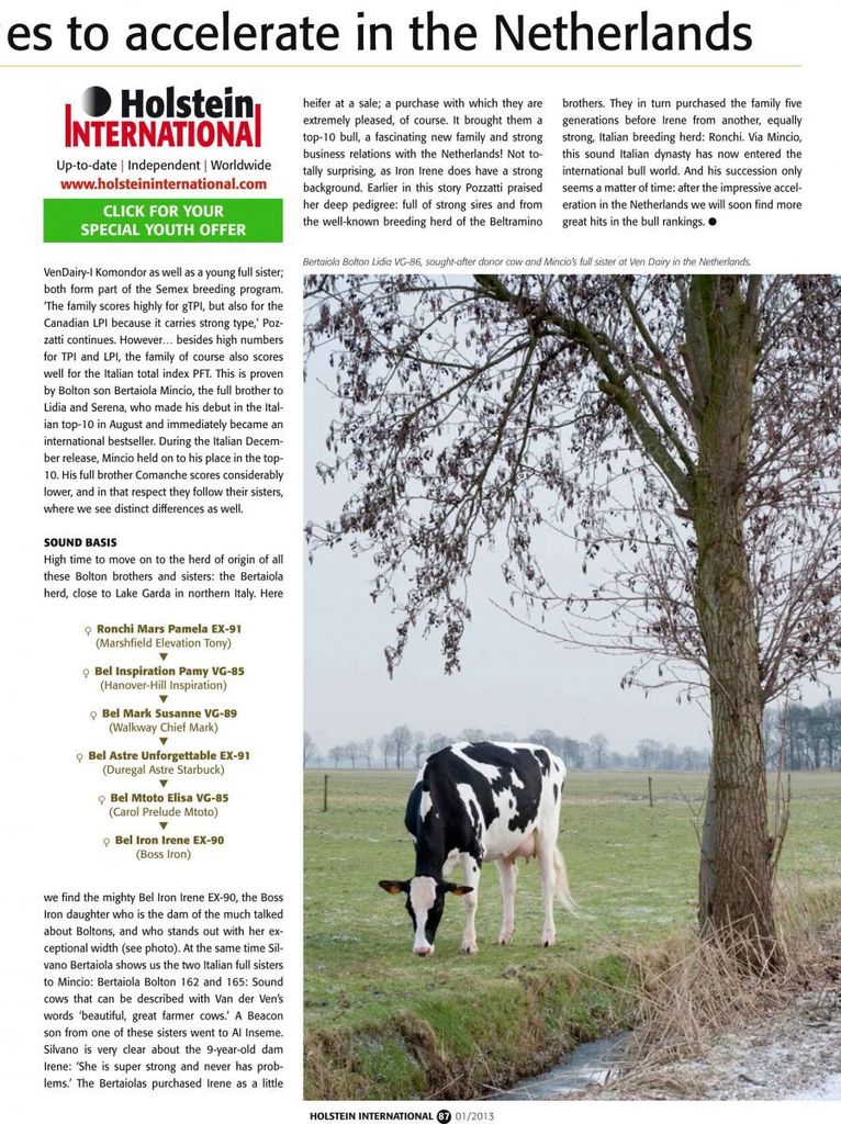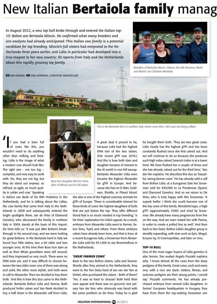 Click further for the article about the Bertaiola Lidia cow family out of the most recent edition of the Holstein International! Lot 10 in the Eurogenes Online Embryo Sale are embryos sired by Alta EMBASSY (GTPI +2425) from the very best of the Lidia's: Bertaiola Alx Lidia VG-87 2yr., the #1 GTPI Alexander in Europe, Top outcross cow and from the full sister to Mincio!