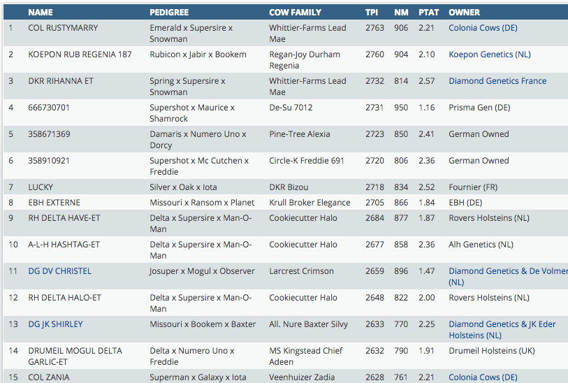 The Top 50 GTPI of the European females from the January 2016 intermediate run are online, click here for the complete Top 50. Both the #1 and #3 GTPI heifer of this run are from the same dam: Rusty 2, a Supersire x Snowman from the Whittier-Farm Lead Mae EX-95-USA family, owned by Zwambag Holsteins. Her highest dtr this run is Col Rustymarry (s. Emerald) with GTPI +2763 owned by Colonia Cows from Germany which purchased her as an embryo through the Eurogenes Embryo Webshop. The #3 this run is her maternal sister DKR Rihanna (s. Spring) with GTPI +2732 owned by Diamond Genetics Frnace. The #2 this run is Koepon Rub Regenia 187 (s. Rubicon) with GTPI +2760 from the Regan-Joy Regenia family. Click further for the complete ranking.