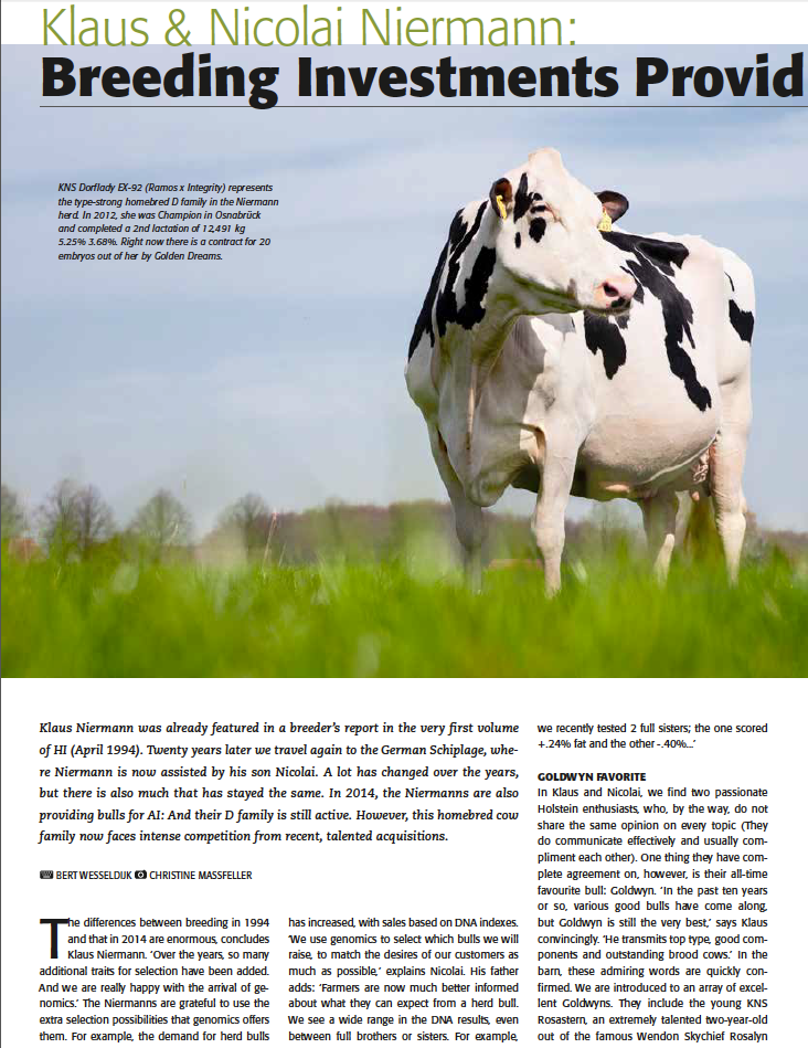 KNS Holsteins from the Niermann family in Germany (Osnabrück region) is a well known name in the breeding business. They have been extremely successful in the past years with high returns on their investments! Read the complete article about KNS Holsteins from the Holstein International May 2014 edition.