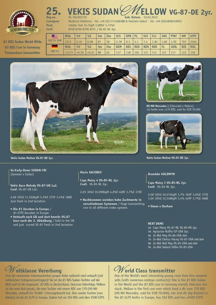 Vekis Xaco Melody is just fresh in her 2nd lactation and has raised her score to VG-87-UK with a VG-88 udder in the UK! She sold pregnant in the Vekis Spring Sale earlier this year to Shavington Holsteins in the UK. Melody is the #1 GTPI Xacobeo dtr in the World and comes straight out of Caps Mairy 4. Melody has s been a great brood cow, being dam to Vekis Sudan Mellow VG-87-DE 2yr. (#1 RZG Sudan dtr) which is dam to the first heifer ever testing over RZG 170 (NH HS Mercedes, sold for EUR 70.000) and to NH HS Balisto Marilyn Monroe, one of the highest heifers in the breed testing over 2500 GTPI, >3500 DGV LPI and over 160 RZG!