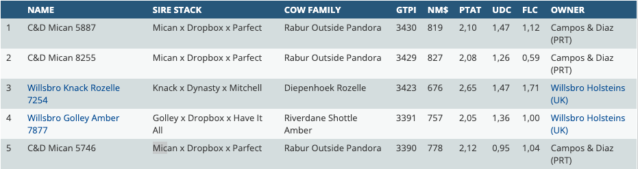 Today it's time for a great new ranking with females in Europe at >3200 GTPI in combination with >2.00 PTAT! We will introduce you the top 25 females in Europe based on the December 2025 proof where you can find early daughters of Mican, Golley, Hi-Worth and more. Charttopper in this ranking is a Mican daughter from Portugal going back on Rabur Outside Pandora at +3430 GTPI in combination with +2.10 PTAT. In second follows her full sister at +3429 GTPI with +2.08 PTAT. Making the top 3 complete with a Knack daughter from the United Kingdom with Willsbro Knack Rozelle 7254 at +3423 GTPI with +2.65 PTAT!