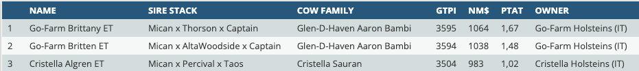 The influence of Ocd Trooper Sheepster is huge worldwide! The daughterproven Trooper son is the Nr. 1 GTPI sire worldwide at +3572 GTPI! He has 444 daughters in his US-index at 72 farms, guarantees +1521kgM, +0.25%F, +0.07%P and a balanced type. He has several sons worldwide that score highly. His highest-scoring son is Beyond Hi-Level, he has a GTPI of +3612! More high ranking Sheepster sons are Beyond Shpstr Golley at +3605 GTPI, Progenesis Watchman at +3568 GTPI, Beyond Hi-Pace at +3566 GTPI, S-S-I Sheepster Mican at +3535 GTPI and more! Eurogenes made a ranking with daughters of Sheepster sons in Europe! This ranking is dominated by daughters of S-S-I Sheepster Mican (Sheepster x Deluxe) and Beyond Hi-Pace (Sheepster x Deluxe).