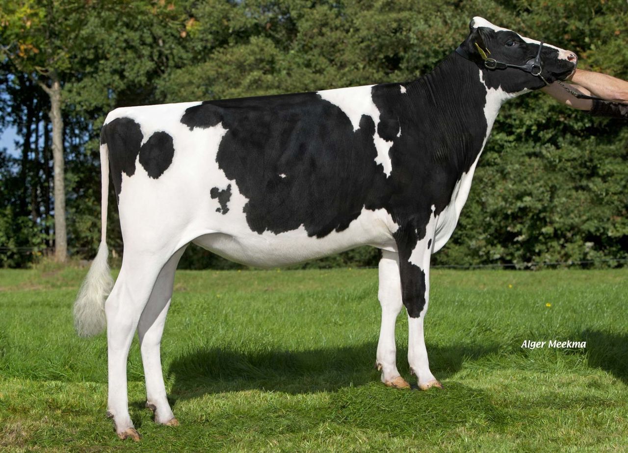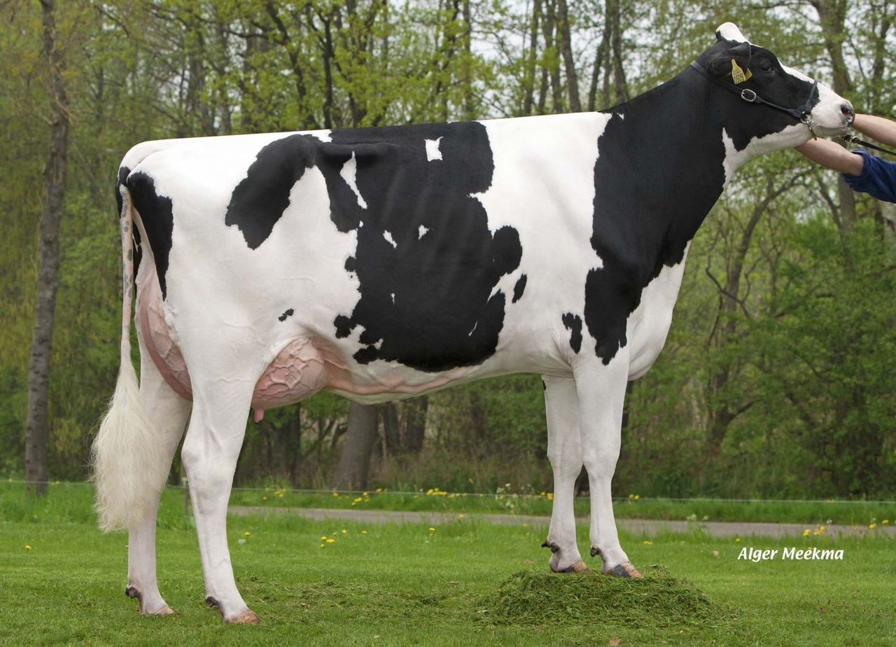 Vekis Paige (s. Numero Uno) is the #1 RZG Heifer Worldwide, born in 2012 with +157 RZG! Paige goes back on the American brood cow El-Dor Saber Pansy EX-95-USA, through a tremendous sire stack with the bulls Xacobeo, Stol Joc, Laudan, Durham and Formation! Her pregnancies made with the #1 RZB bull Balisto (RZG +166) are some of the highest PA RZG pregnancies world wide right now. A 1st Choice bull from this pregnancies sells in the Online Elite Bull Sale (Start: November the 13th 2013)