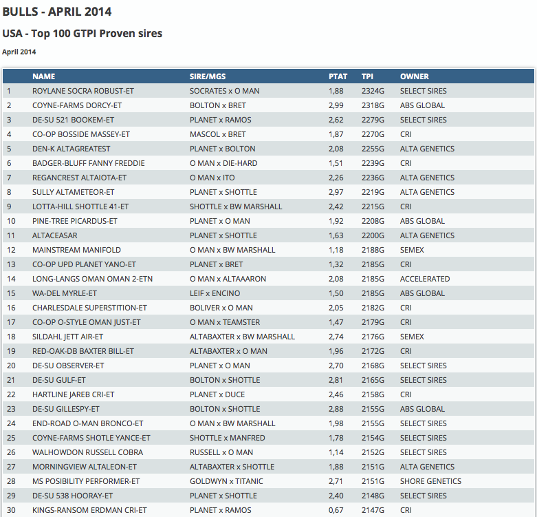 A great run for the heavily used genomic bulls in the USA. Also based on their daughter information they exceed their high expectations. The new #1 dtr proven sire in the USA is Roylane Socra Robust, which added more than 200 daughters to his index and increased 74 TPI points, this makes him the #1 daughter proven sire in the USA with GTPI +2324! The ranking follows by Dorcy, Bookem, Massey and Greatest. Click further for the complete Top 100 of American proven sires.