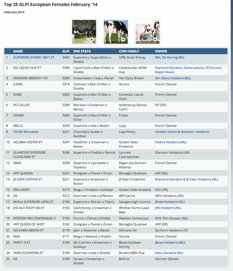 Supersire Sheray 5851 the #1 GLPI Heifer in Europe of the February 2014 run with GLPI +3404! She is a daughter of Supersire from the great UFM-Dubs Sheray cow family. She is followed by the earliest Liquid Gold dtr in Europe, DG Liquid Hue, from the Cookiecutter branch of the Dellia EX-95 cow family. Click further for the complete European Top 25 GLPI of the February 2014 run.