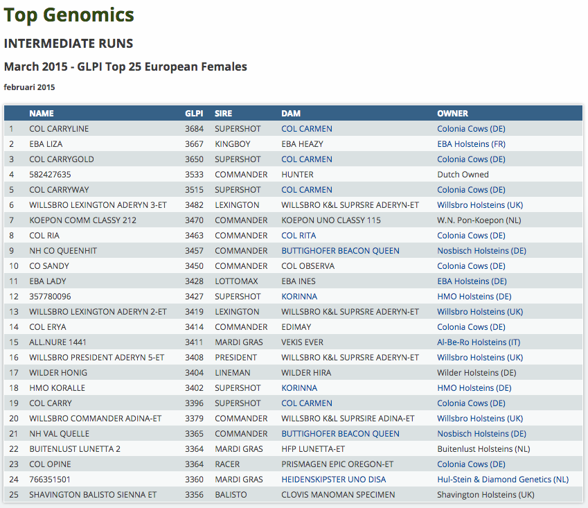 Today was the Canadian GLPI March 2015 run. The #1 European heifer in this list this time is COL Carryline, a GLPI +3684 Supershot out of Col Carmen, a Headliner dtr from Drouner ADJH Freddie Cosmo, followed by Larcrest Cosmopolitan. Carryline is one out of 4 full sisters in the Top 20 GLPI of this run. The Top 25 GLPI of the March 2015 run dominated by Colonia Cows from Germany with 8 heifers in the list!!
