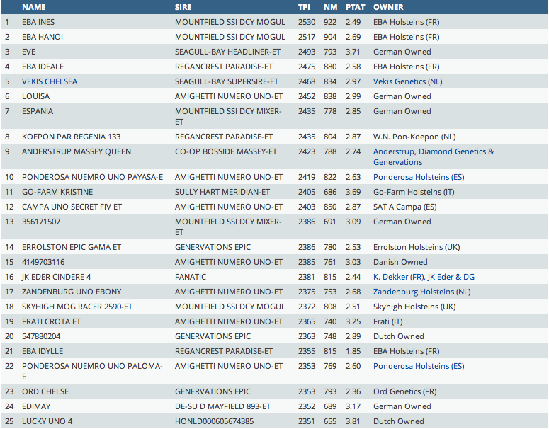 A great index run for Eurogenes member Vekis Genetics with Vekis Chelsea who is from the a great branch of the Cosmopolitan's came back with +2468 GTPI what makes her the #1 Supersire dtr / #5 GTPI heifer of the June run! Click further for the top 25 GTPI of June 2013!