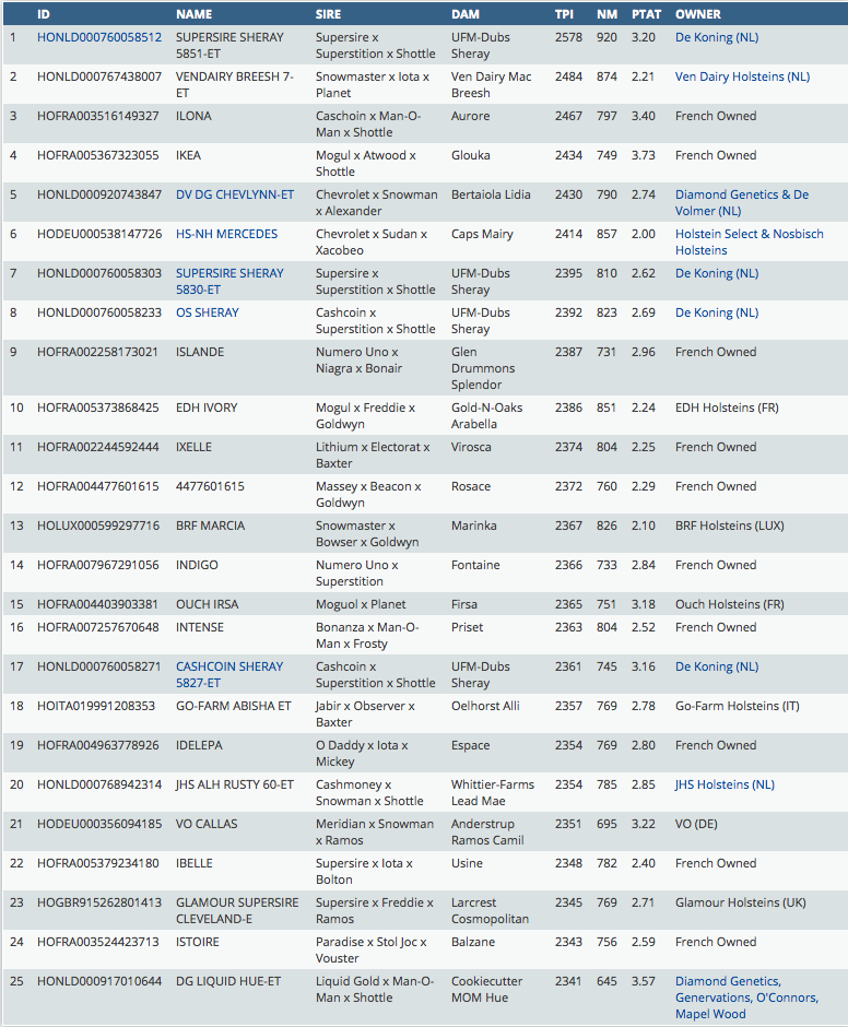 Click further for the top 25 GTPI Females in Europe of the February 2014 run. A Dutch heifer, Supersire Sheray 5851 from de Koning was the #3 GTPI heifer World Wide from the February run and is the new #1 GTPI heifer in Europe with GTPI +2578. Click further for the complete list.