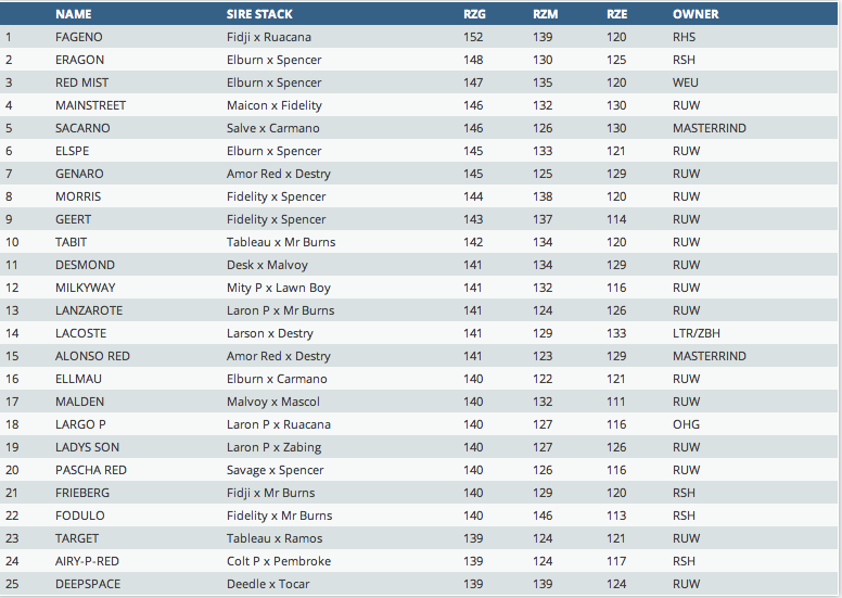 Click further to for the top 25 RZG genomic bulls of Germany! Boss is leading with +161 RZG! He is from the great Man-O-Man-daughter, KNS Rendezvous going back on the Radieuse family!