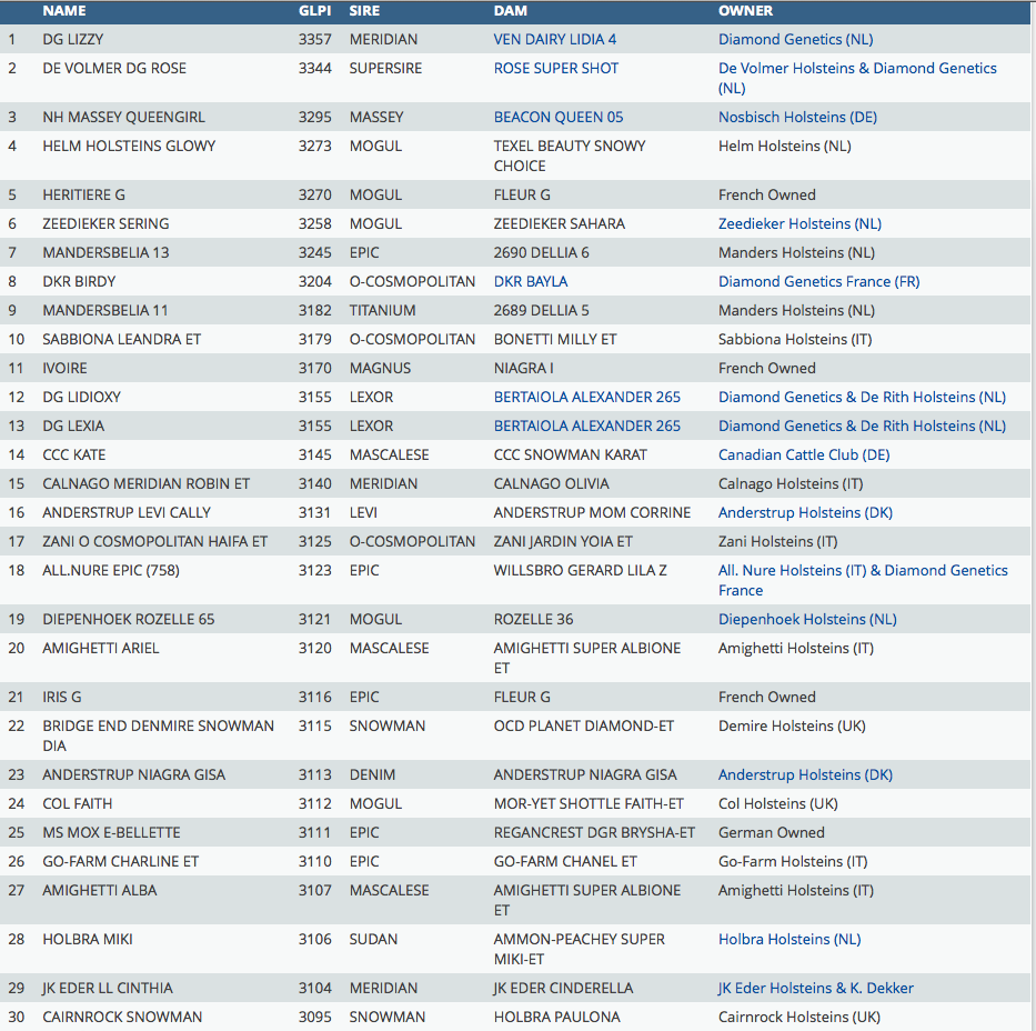 Click further for the Top 30 GLPI of European tested animals based on the Canadian GLPI index with great results for the Eurogenes-members. See complete list.