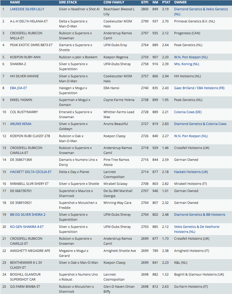 Lakeside Silver LIlly (owned by Diamond Genetics & Vekis Genetics) is the new #1 GTPI heifer in Europe with GTPI +2800, combined with +3.19 PTAT! #2 GTPI heifer in Europe is A-L-H Delta Helania with GTPI +2799 owned by Primeval Genetics B.V., the #3 GTPI Crossfell Rubicon Milla (GTPI +2797) was sold through the Vekis Spring Sale to Progenesis from Canada. Click further for the complete Top 50 GTPI of European females (04/16).