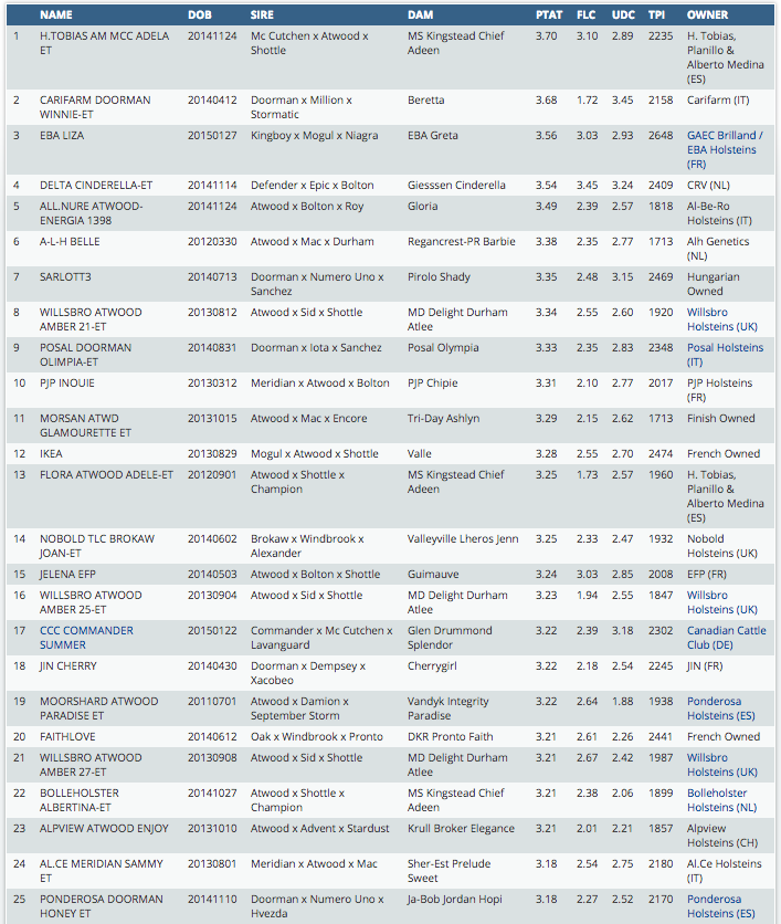 The highest European PTAT (Type) heifer is H. Tobias Am Mcc Adela with PTAT +3.70, she is a McCutchen dtr out of Flora Atwood Adele NC which sold as an embryo through the Eurogenes Online Embryo Sale and is full sister of the reigning #1 PTAT sire Archrival out of the Chief Adeen family, her dam is the #1 PTAT cow (>2 years) in Europe and she has 3 daughters in total in the European PTAT Top 50. EBA Liza, the #3 PTAT heifer is really unique with PTAT +3.56 combined with +2648 PTAT! Great run for Willsbro Holsteins from the UK, 8 heifers with the Willsbro prefix are in the European PTAT Top 50! Click further for the complete ranking.