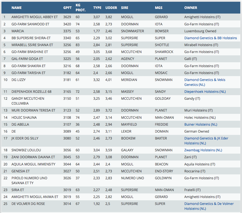The Top 75 is online for the the Italian and internationally tested heifers on the Italian gPFT index. Several heifers are owned by Eurogenes members. Click furhter for complete list and pictures.