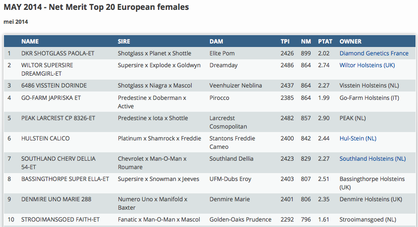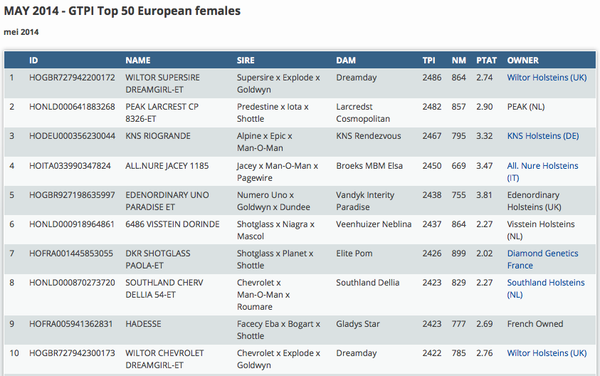 Click further for the top GTPI, Net Merit & PTAT rankings of European tested females tested in May 2014!