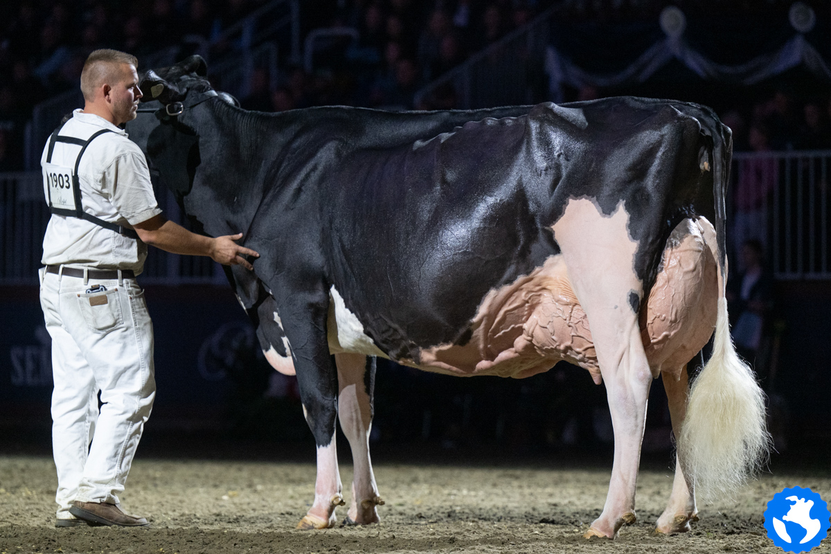 Unix daughter Altona Lea Unix Herminie, exhibited by Dalton Faris, East Gwillimbury, Ontario has been crowned by judge Joel Lepage and Associate Judge Jean-Philippe Proulx as the new Grand Champion of the Royal Winter Fair 2025. In second follows Eixdale Pwrup Alongside with the Reserve Grand Champion title at the Royal Winter Fair. The Alongside daughter from Milksource Genetics, Kaukauna, Wisconsin was Reserve Senior Champion last month at the World Dairy Expo. West-Adub Lambda Sadie won the H.M. Grand Champion title after winning the Intermediate Champion ribbon earlier that day and her class with Jr. 3yr. olds.