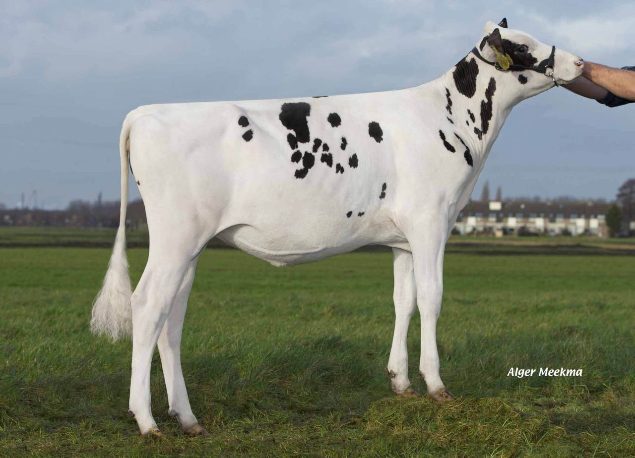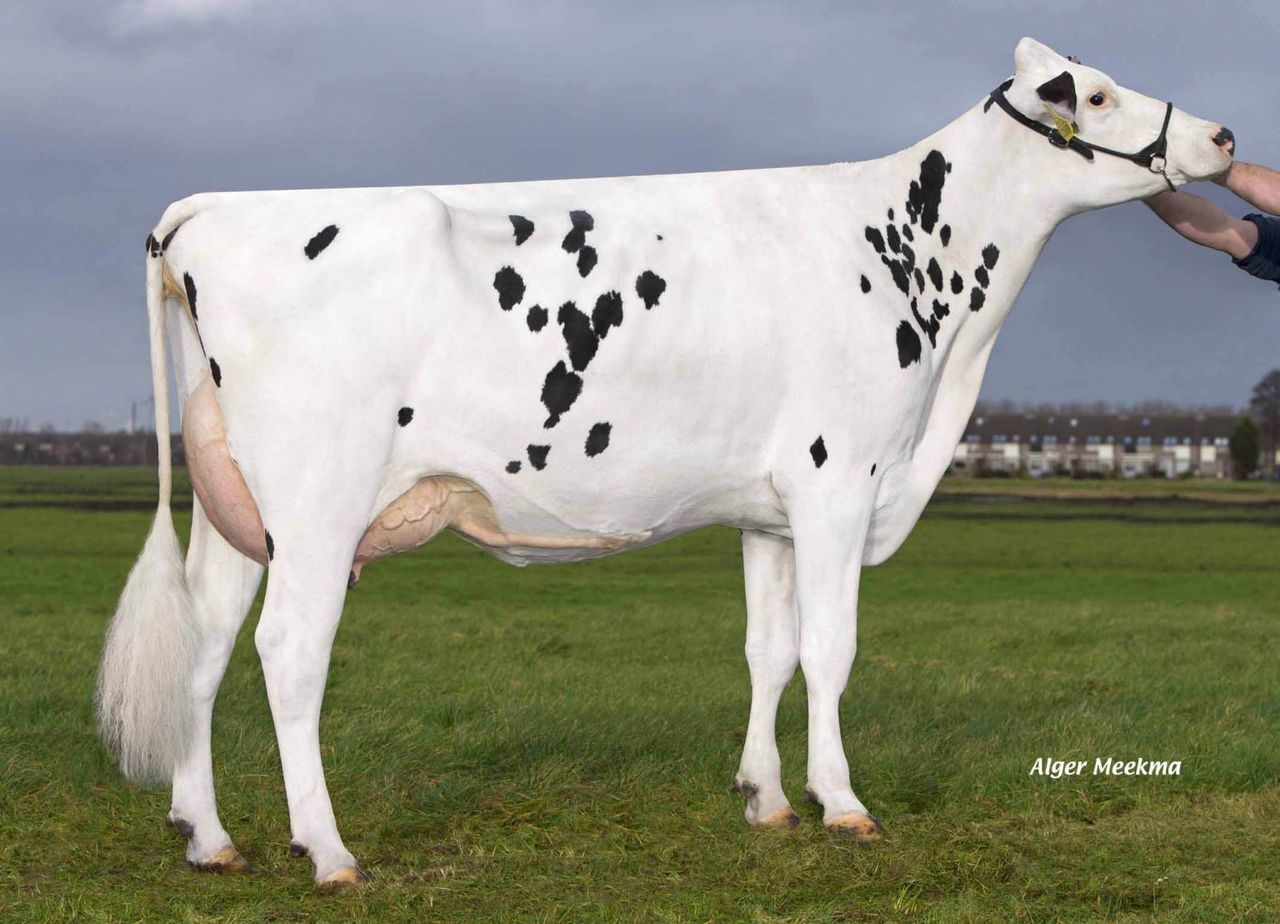 Riethil White Rain have been classified VG-86 with a VG-86 udder. Riethil White Rain attracted global attention after her sky-high GTPI index as a calf, embryos from her have been exported all over the world! She goes back on the great American cow family of Snow-N Denises Dellia EX-95, famous from bulls like Halogen, Iota, Durham, Damion and more! Also her progeny is doing great, her dtr Riethil White Fan is the #1 GTPI Fanatic dtr World Wide with GTPI +2416 and scores high in Germany as well with RZG 151! Click further for picture of White Rain and her offspring.