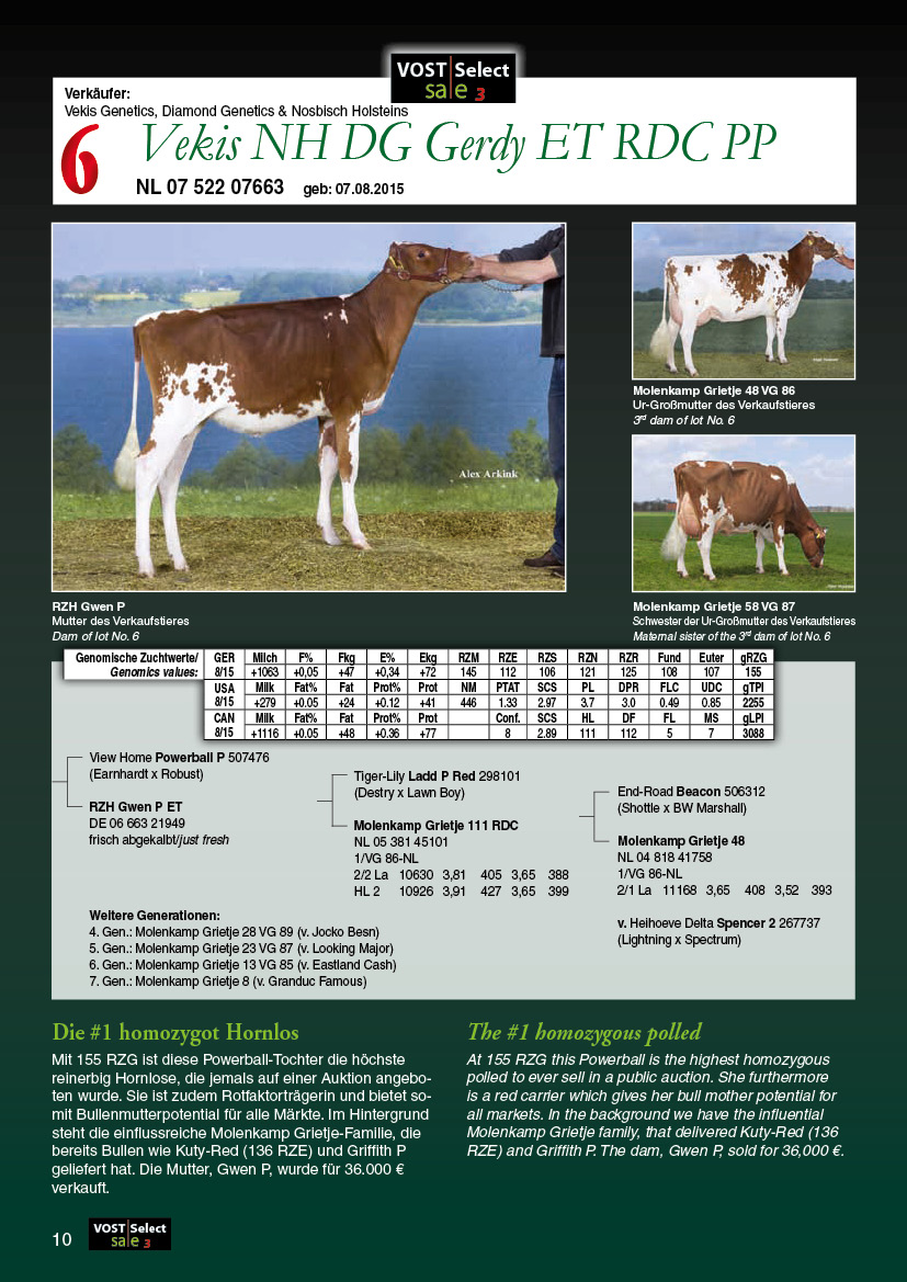 RZH Gwen (s. Ladd P), the former #1 Red & Polled Heifer for RZG and one of the highest Red & Polled milkers for RZG scored VG-88-NL as a 2yr. old! She is from the very successful Molenkamp Grietje cow family and was sold as a young heifer to Vekis Genetics, Nosbisch Holsteins & Diamond Genetics. Her first sons by Esperado & Powerball-P have already left to AI. Gwen is projected > 9.500kg Milk in her 1st lactation with 3.7% Protein!! Her one and only Homozygous Polled Powerball-P daughter with +155 RZG (B&W base) will sell this Friday in the Vost Select Sale 3!