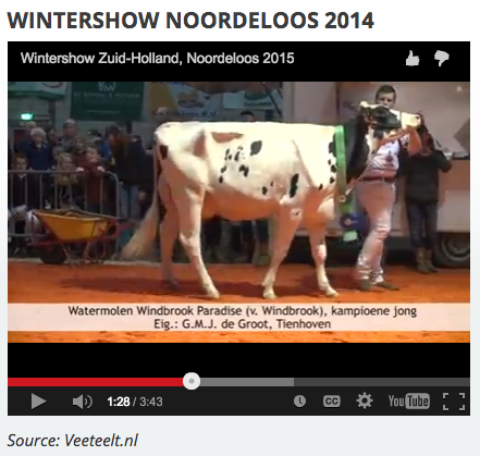 The Wintershow Noordeloos held last Saturday judged by Nico Bons resulted in the R&W Annie 127 (s. Joyboy) named Grand Champion. A fantastic day as well for Watermolen Holsteins with 2 members from the Windy-Knoll-View Pledge cow family. Watermolen Windbrook Parad was 1st and best udder in her section on won the 2-Yr. Old Championship. She is a Windbrook x Damion x Goldwyn x Windy-Knoll-View Pledge! Click further for more results and video.