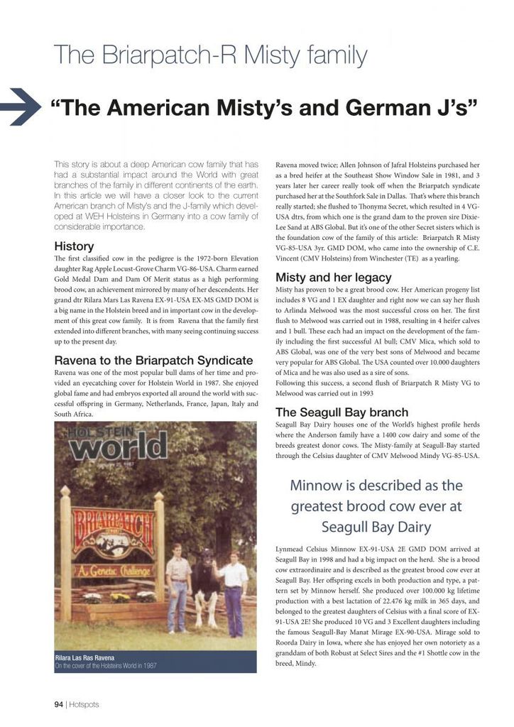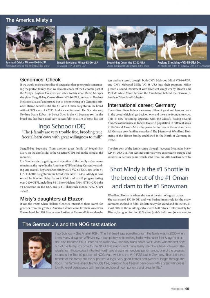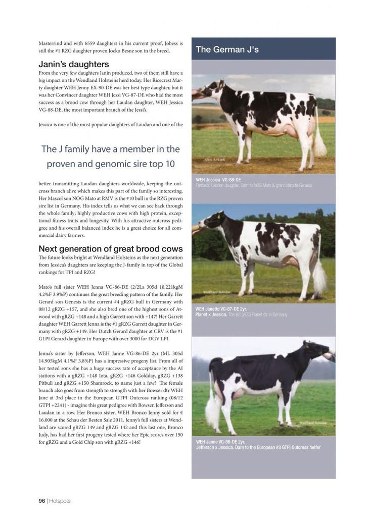 WEH Bronco Jill VG-85-DE 2yr. is the #1 RZG cow in Germany with RZG 151 and is bred by Eurogenes member WEH Holsteins, from the Hintze family in Germany. The German J-family belongs to the strongest transmitting RZG families in the world and goes back on the American Briarpatch-R Misty VG-85-USA 3yr. GMD DOM, a family which also produced Robust. Click further for the article "The American Misty's and German J's".