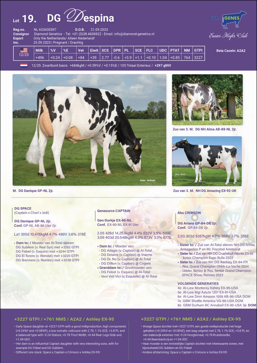 The Easter Heifer Sale - Online Tag+ started yesterday and will come to an end at friday march the 27th, 2026 at 08.00 p.m. (Dutch Time). Additional lot 19: DG Despina! She is a pregnant Space daughter with +3227 GTPI and a great US-index! Despina is sister to multiple sons in AI, with for example AI-Total bulls Subliem at +3262 GTPI, Fideel at +3244 GTPI, El Torero at +3220 GTPI and Brennero at +3238 GTPI. Her granddam was last weekend 2nd in the production cow class at the wintershow in Beilen 2026, a great milkproduction cow and has also interesting sons in AI.