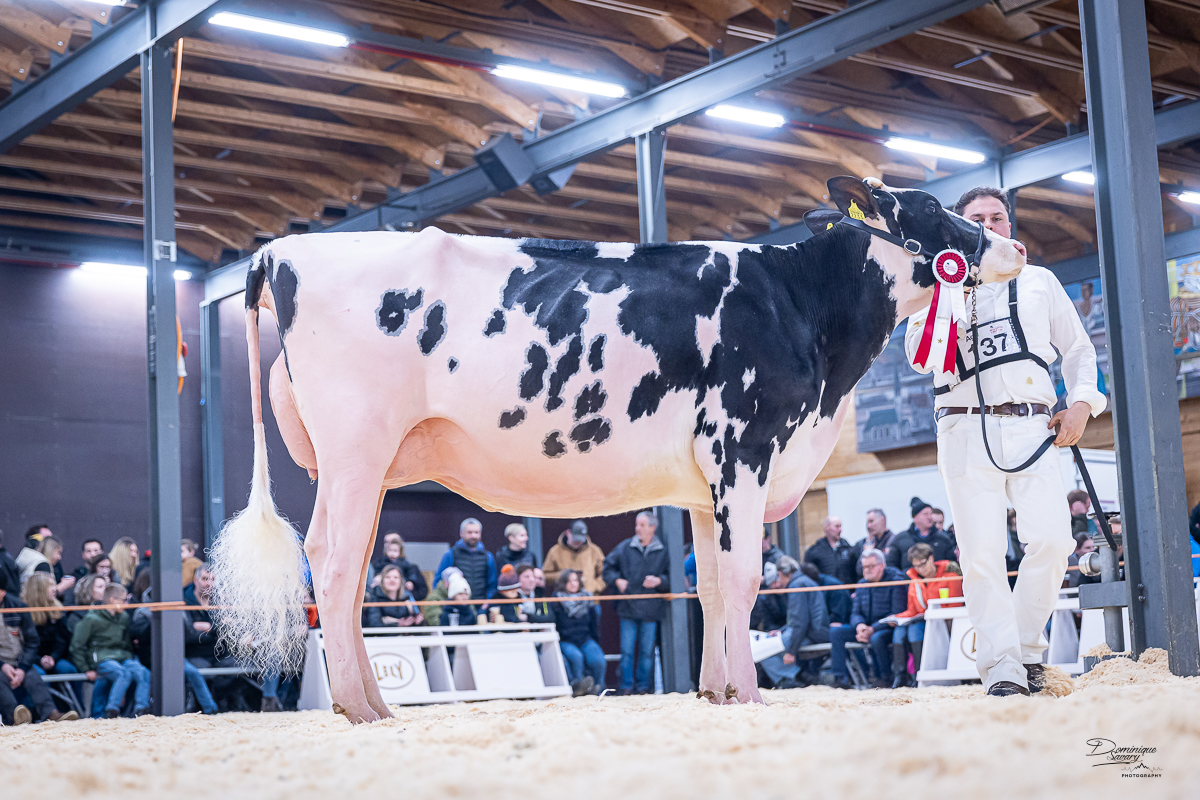 Take a moment for this exciting picture of the Junior Champion Expo Gruyère 2026, Kolly-JL Arrow Nuance! She won last weekend her class at the Expo Gruyère 2026 and is crowned as Junior Champion by judge Julien Pichonnat. This 2yr. old NH DG Arrow daughter from a EX-90 Calvados dam is owned by Ferme Kolly-JL & Richard Gaëten, Switzerland and classified with VG-87-CH 2yr. with VG-87 for her Mammary System! The daughter proven type sensation: NH DG Arrow, is a King Doc son from Al-Lew Monterey Ashley EX-95-USA and has already a lot of beautiful and showwinning daughters worldwide! Arrow is bred by Diamond Genetics & Nosbisch Holsteins and sold to AI-Total. With 3770 daughters in his US-index at 1151 herds, he shows us +2720 GTPI with +2.19 PTAT and +1.54 UDC! Furthermore he has +0.02% Fat and +0.03% Protein in his index with +2.04 Stature, +1.41 Strength, Sloped and Wide Rumps, +2.20 Fore Udder Attachment, +1.89 Rear Udder Height and +1.70 Rear Udder Width!