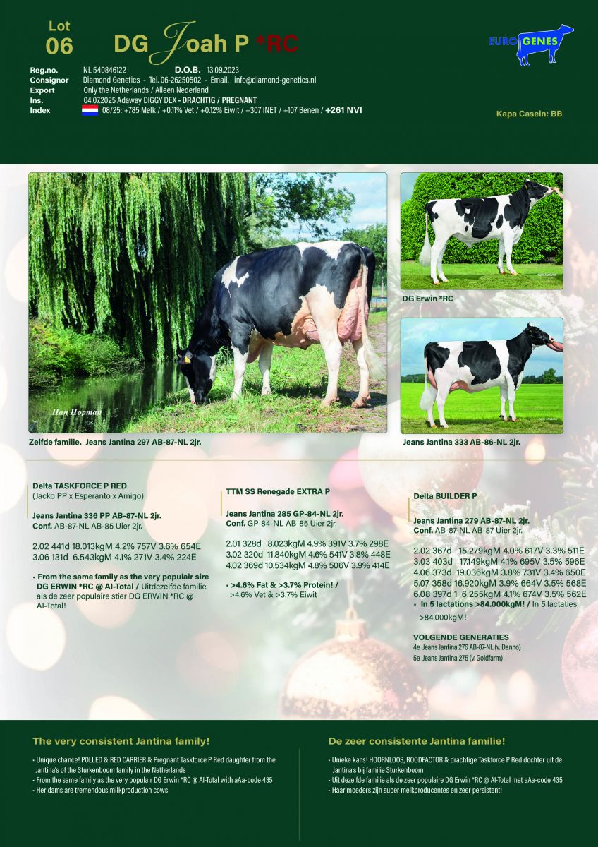 The Eurogenes Christmas Sale - Online Tag+ is coming to an end. Many interesting heifers are selling with great pedigrees, pregnant, Polled and Red Carrier, with for example DG Joah P *RC! She is a Taskforce P Red daughter, pregnant (due date April 2026) and from a tremendous Dutch cow family. Her dam is the polled Extra P daughter: Jeans Jantina 336 PP VG-87-NL VG-85-MS 2yr. out of Builder P daughter Jeans Jantina 285 GP-84-NL 2yr. She is a great production cow with in each lactation >3.7% Protein! This family delivered many complete sires to AI, with for example DG Erwin *RC @ AI-Total, Rennes and Hummer P.