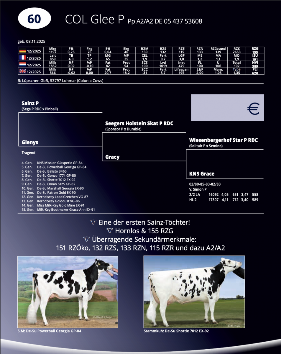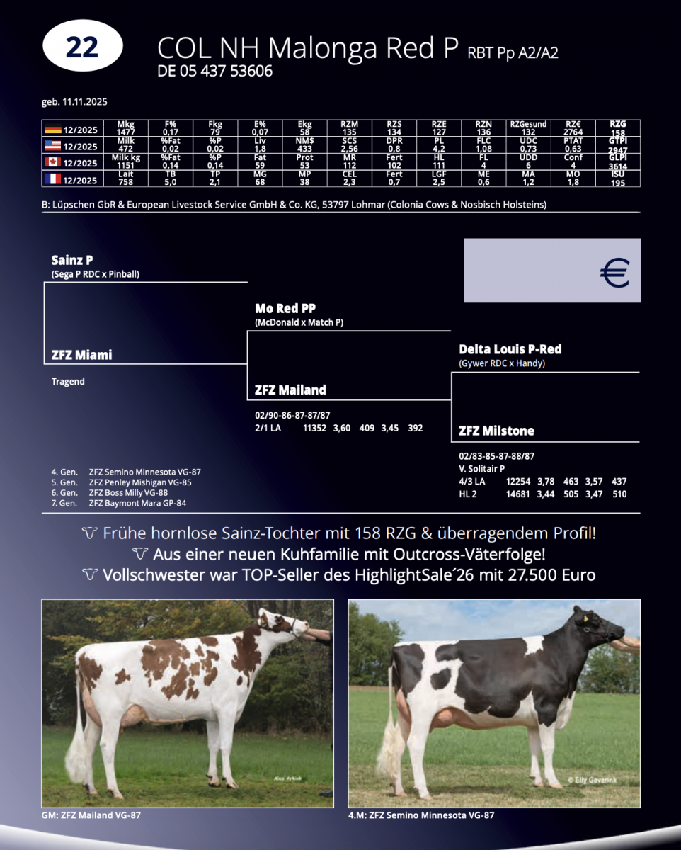 February the 26th is it time for the Schau der Besten in the Niedersachsenhalle in Verden, Germany. One of the greatest shows in Germany with a super ambience and big quality of the cows. The night before the show Masterrind will have an auction with top genetics. Several Eurogenes members have offered the very best for this auction. Colonia Cows and Nosbisch Holsteins are selling an early red&white and polled Sainz P daughter with +158 RZG as Lot 22. Her full sister was topseller of the Highlight Sale 2026, she is sold for 27.500 EUR.