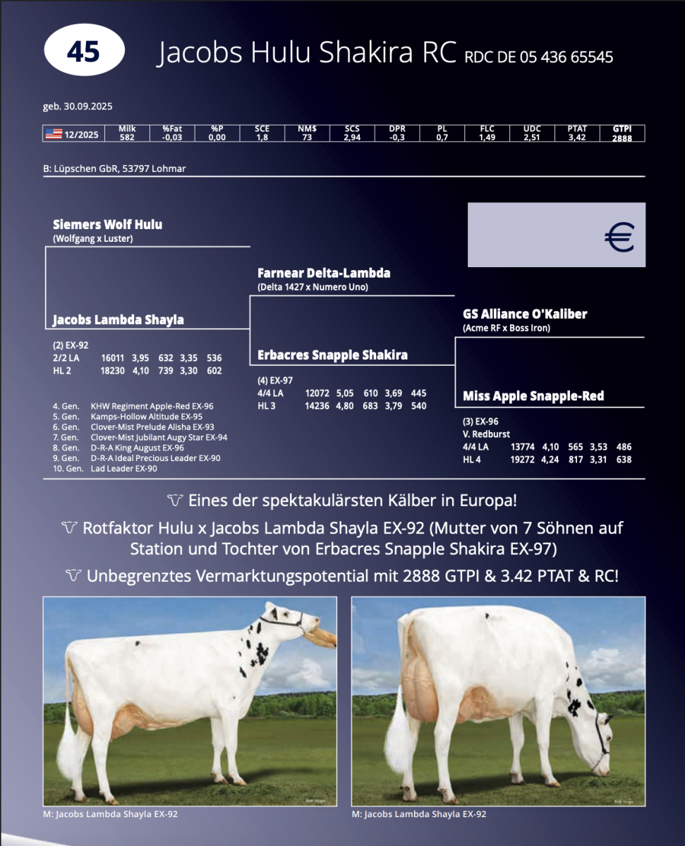 You can get a granddaughter to Erbacres Snapple Shakira EX-97-CAN, the Grand Champion World Dairy Expo 2021 & 2023 and Honorable Mention World Dairy Expo 2024. Her Hulu *RC granddaughter is selling as Lot 45 during this sale. She guarantees +3.43 PTAT with +2.50 UDC and +13 Conformation. Her dam is Jacobs Lambda Shayla EX-92-USA, she is dam to 7 sons in AI, with for example, Shaylas Sharpshooter @StGenetics, Mr. Budjon Superman @ Blondin Sires, Shaylas Tidalwave-Red @ StGenetics.